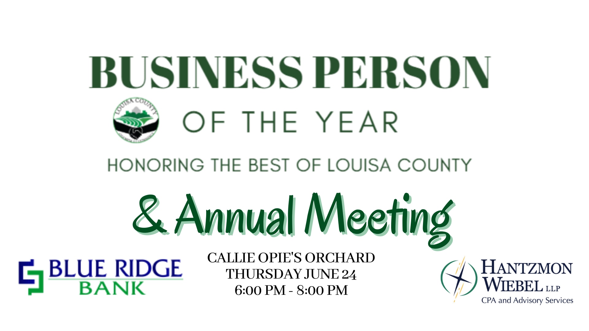 Join us for the Louisa County Chamber of Commerce Annual Meeting and the celebration of Businessperson of the Year at Callie Opie's Orchard on Thursday, June 24 between 6:00 pm - 8:00 pm*.