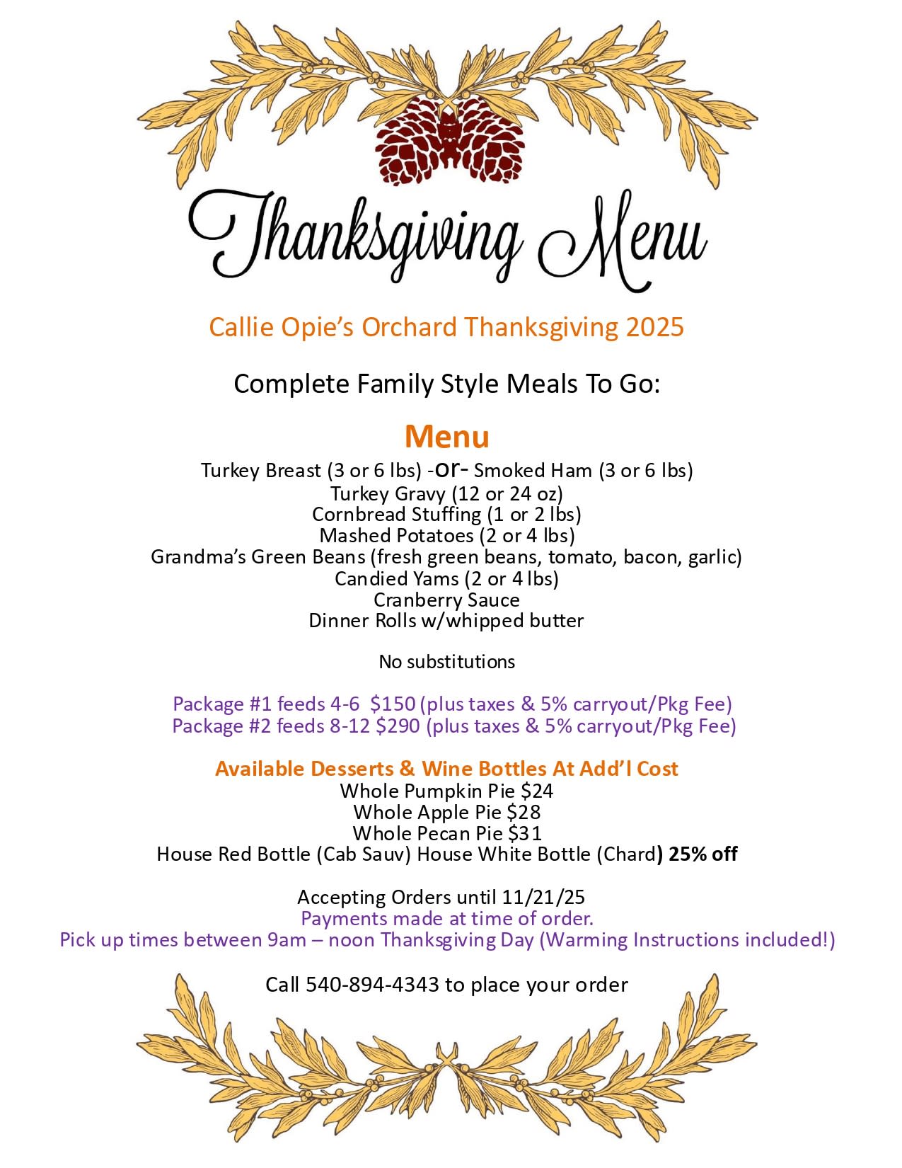Complete Family Thanksgiving Meals to go, from Callie Opie's Orchard