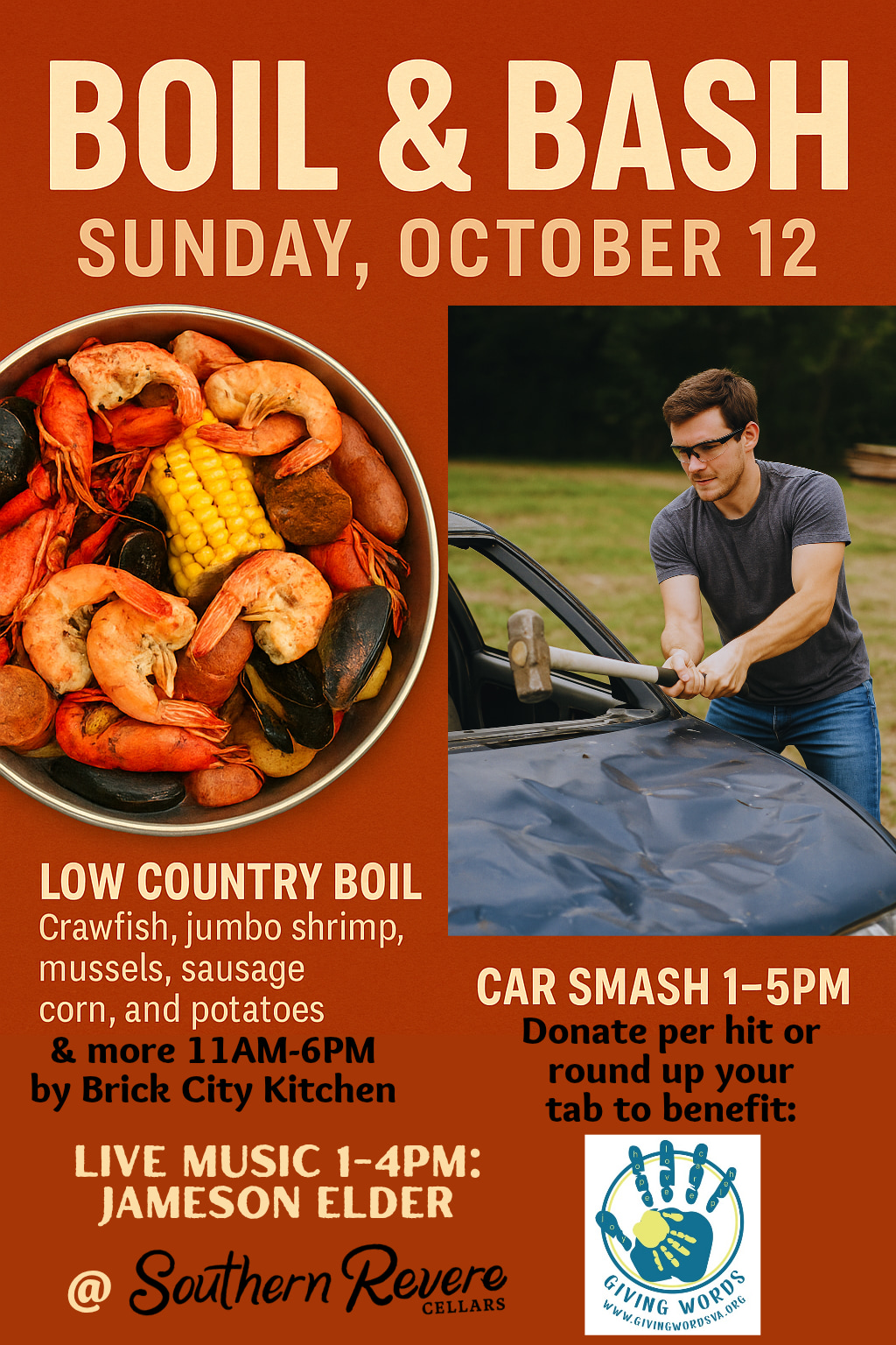 Join us Sunday, October 12th at Southern Revere Cellars for Boil & Bash: Fundraiser for Giving Words