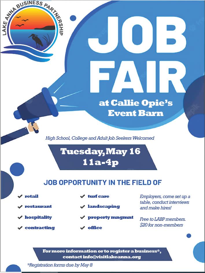 Event by Lake Anna Business Partnership Callie Opie's Orchard Duration: 5 hr Public · Anyone on or off Facebook Job fair for Lake Anna area businesses looking to hire high school, college students and adults for seasonal and long term employment