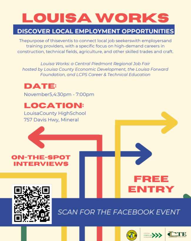 Discover your next opportunity at Louisa Works, a first-of-its-kind regional career event designed to connect local job seekers and students with employers, training programs, and career resources from across Central Virginia.