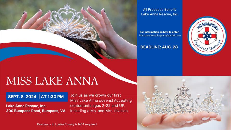 Join us as we crown our first Miss Lake Anna queens! Accepting contentants ages 2-22 and UP. Including a Ms. and Mrs. division. All proceeds benefit Lake Anna Rescue, Inc. Residency in Louisa County is NOT required. Pageant entry fee: $50 Siblings: $40 Photo: $10 Tiny Miss Lake Anna - Ages 2-3 Little Miss Lake Anna - Ages 4-6 Young Miss Lake Anna - Ages 7-9 Pre-teen Miss Lake Anna - Ages 10-12 Teen Miss Lake Anna - Ages 13-16 Miss Lake Anna - Ages 17-22 Ms. Lake Anna - 23+ Mrs. Lake Anna - 23+ For more information on how to enter, please email MissLakeAnnaPageant@gmail.com. Deadline to enter: August 28, 2024. All winners will be expected to represent Lake Anna Rescue, Inc during the Lake Anna Rescue Lifesavers Challenge event on Sept. 14, 2024 from 10-2 p.m.