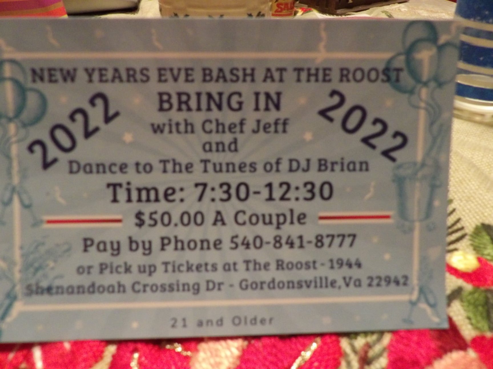 Bring in the New Year at Raptors Roost with Chef Jeff while dancing to the tunes of DJ Brian and Davey Ray's live Elvis tunes !!!