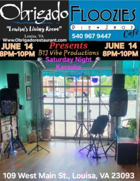 Join BTJ Vibe Productions for a fun-filled night of karaoke on June 14 from 8–10 PM at Obrigado and Floozies Café in downtown Louisa. Grab a bite, pick your song, and sing your heart out at 109 W Main St, Louisa, VA!