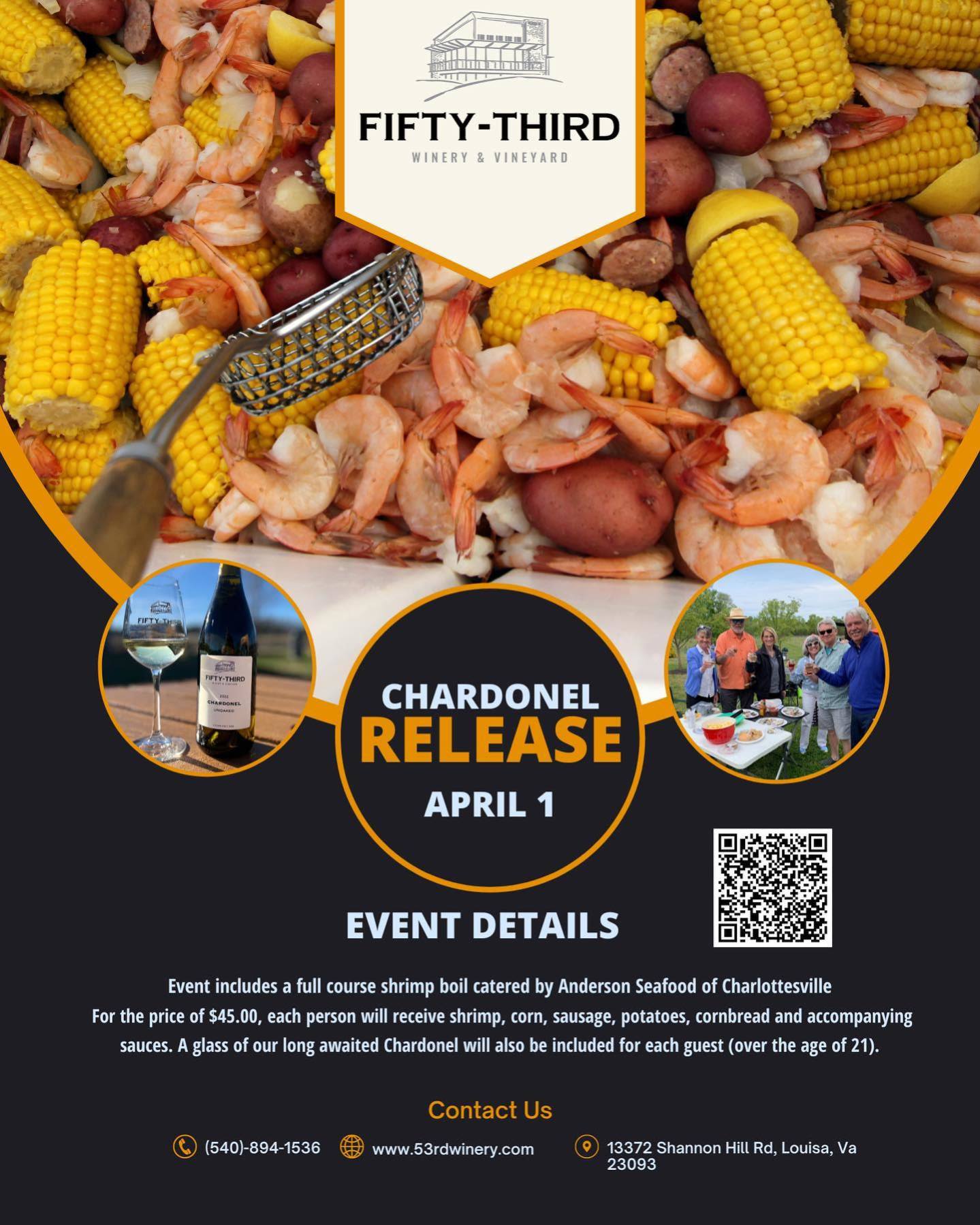 Please join us at our special Shrimp Boil experience as we showcase our newest release. The event is a full course shrimp boil catered by Anderson Seafood of Charlottesville. For the price of $45.00, each person will receive shrimp, corn, sausage, potatoes, cornbread and accompanying sauces. A glass of our long awaited Chardonel will also be included for each guest (over the age of 21)! https://www.exploretock.com/fiftythirdwineryandvineyard/event/399052/shrimp-boil-and-chardonel-release