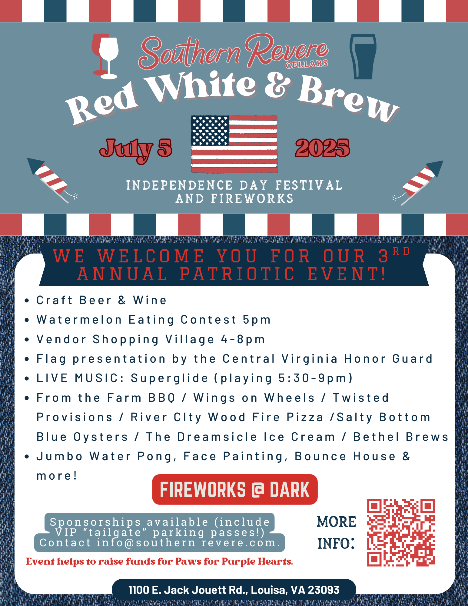 Southern Revere Cellars’ 3rd Annual Red White & Brew: Independence Day Festival & Fireworks 🇺🇸 is happening July 5th, and we’re gearing up for another fun-filled Independence Day celebration 🎉 — delicious food trucks 🍔🍕, festive games 🎯, awesome local vendors 🛍️, live music by Superglide 🎶, and a fireworks finale 🎆 to light up the night!