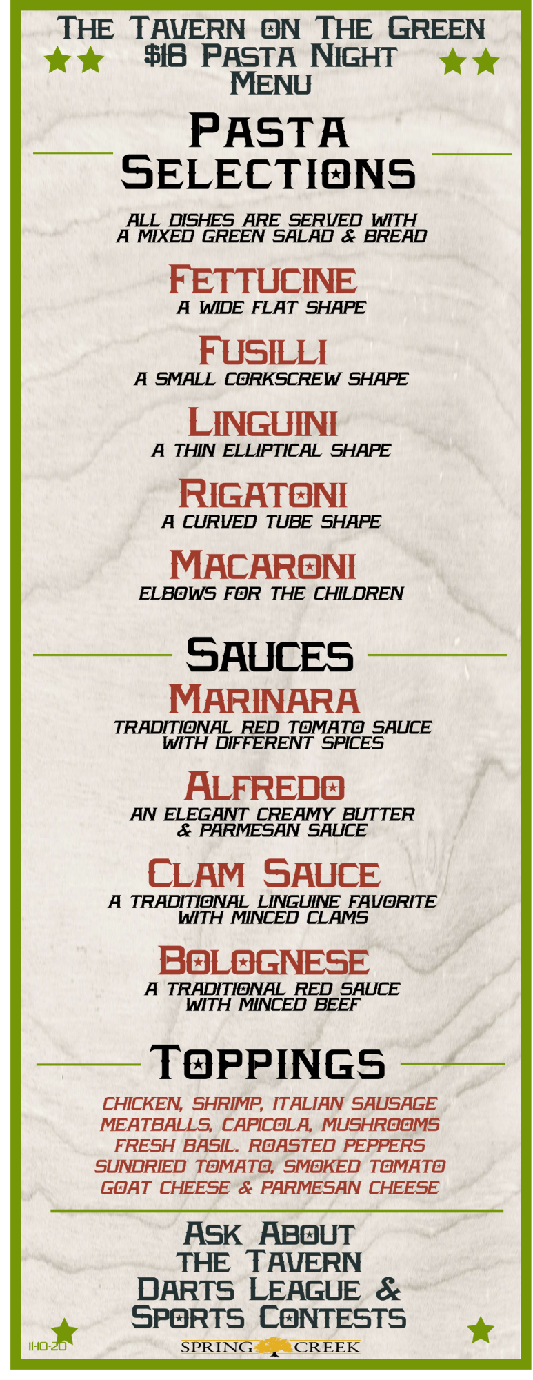 Puttin' for Prizes returns (starts at 7 pm) Pasta Night - you create your own!