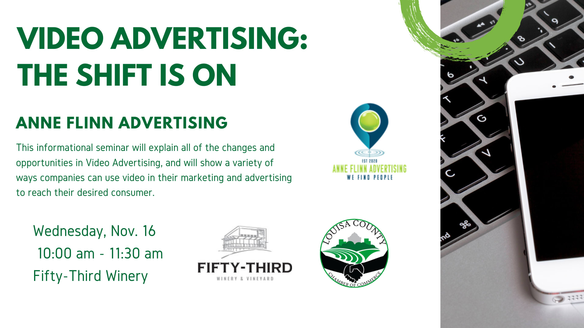 This informational seminar, designed by Anne Flinn Advertising, will explain all of the changes and opportunities in Video Advertising, and will show a variety of ways companies can use video in their marketing and advertising to reach their desired consumer.