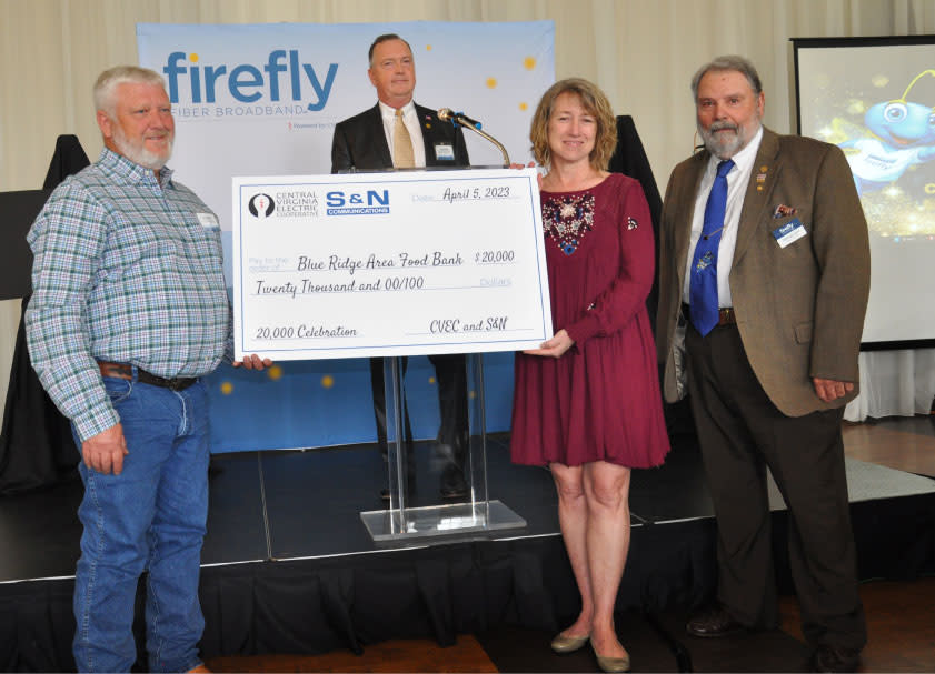 Additionally, CVEC donated $10,000 to the Blue Ridge Area Food Bank (BRAFB), which serves multiple counties throughout the cooperative’s service area. S&N Communications, Inc., Firefly’s fiber construction partner, matched CVEC’s donation in the amount of $10,000. According to the BRAFB, one dollar provides four meals for those in need. The donation of $20,000 will supply over 80,000 meals to the local community.