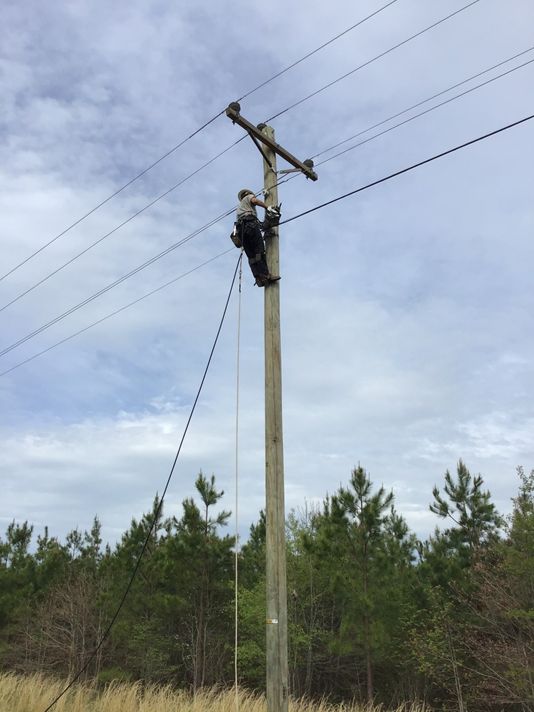 Adding the fiber to the electric pole without a bucket truck. The line technician will attach the equipment to “lash” the fiber to the steel wire that was added during this fiber build. Photo credit: S&N Communications