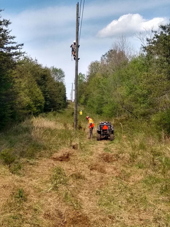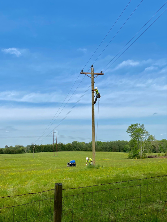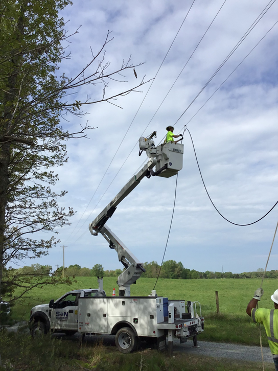 Fiber construction in a field off Poindexter Road in Louisa County. Building fiber in the rural parts of the county can take time, especially when the poles cannot be accessed by a bucket truck. Photo credit: S&N Communications