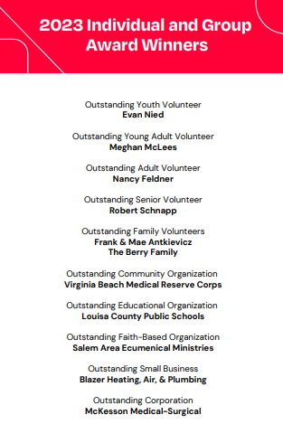 RICHMOND, VA — Governor Glenn Youngkin has announced the recipients of the 2023 Governor’s Volunteerism and Community Service Awards. The annual awards program spotlights the outstanding efforts of individual volunteers, organizations and their contributions on behalf of citizens throughout the Commonwealth.