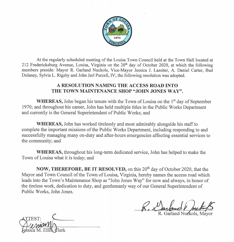 On July 31, 2021, the Town of Louisa dedicated "John Jones Way" for 50 years of service to the town.